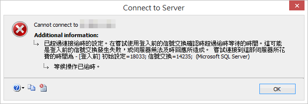 已超過連接逾時的設定。在嘗試使用登入前的信號交換確認時超過逾時等待的時間。這可能是登入前的信號交換發生失敗,或伺服器無法及時回應所造成。