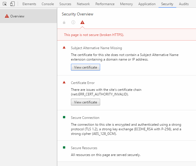 鄉愿了好一陣子,今天痛下決心,認真爬文,才知道這是 Chrome 56 版做的調整。憑證資訊搬家了-按 F12 開發者工具,在 Security 頁籤下,有比以前詳細的問題說明,而檢視憑證資訊按鈕也在這兒。