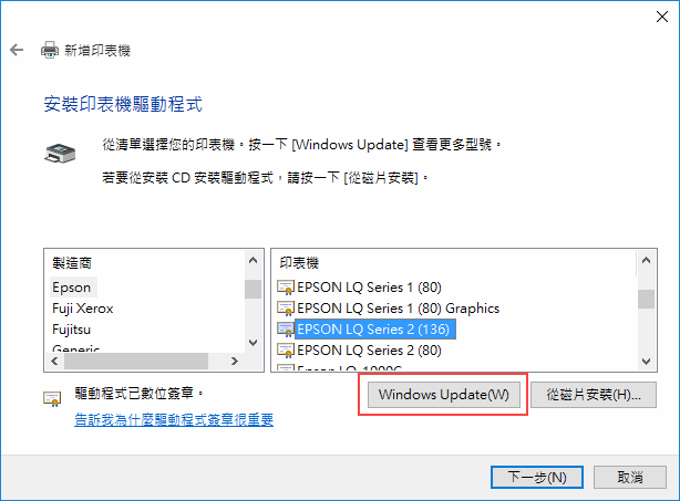 - Window 7 拿掉預設內建的 EPSON LQ 1000 驅動程式,但可在驅動程式選擇頁面按「Windows Update」把它找回來。